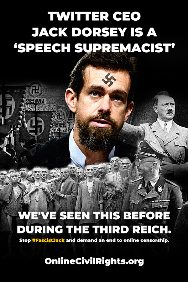 This attack on the freedom to think cannot go unanswered. Under the fascist rule of Jack Dorsey, Twitter has gone from “the free speech wing of the free speech party” to the Fourth Reich of Techno-Fascism. While Adolf Hitler burned books, Jack Dorsey shuts down entire channels, blocking any discussion at all.
