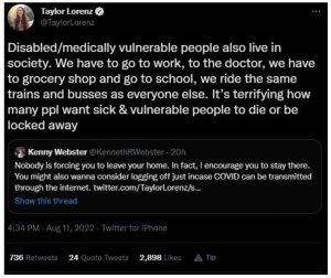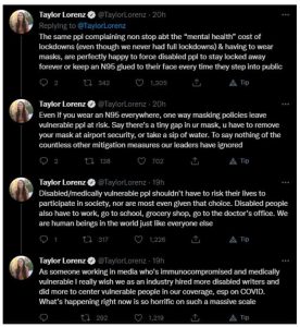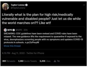 Is this “the end” for Taylor Lorenz? Will she be laid off for the lies and hypocrisy? Will she overdose from the drama of virus-mania-PTSD? Only time will tell. See what she has to say about her Post-Dramatic-Stress Disorder (PDSD), claiming she is medically disabled and about to die of starvation because the CDC dropped their (faked) mandates: